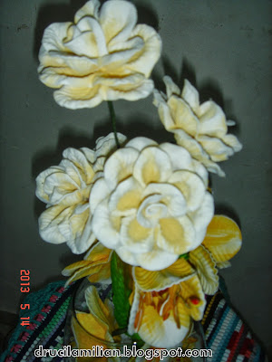 Em 2011 fiz este arranjo de flores de EVA para minha amiga Luh, agora ela me trouxe parte dele para reformar kkkkkk, nem lembrava mais dos botões e das rosas quando vi as imagens até me assustei...